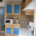 Cuisine équipée avec cuisinière mixte, frigo avec partie congélateur, micro-ondes, machine à café et tout le nécessaire pour cuisiner et manger à l'intérieur comme à l'extérieur.